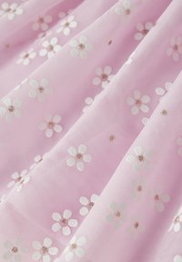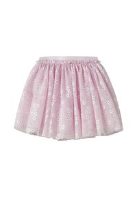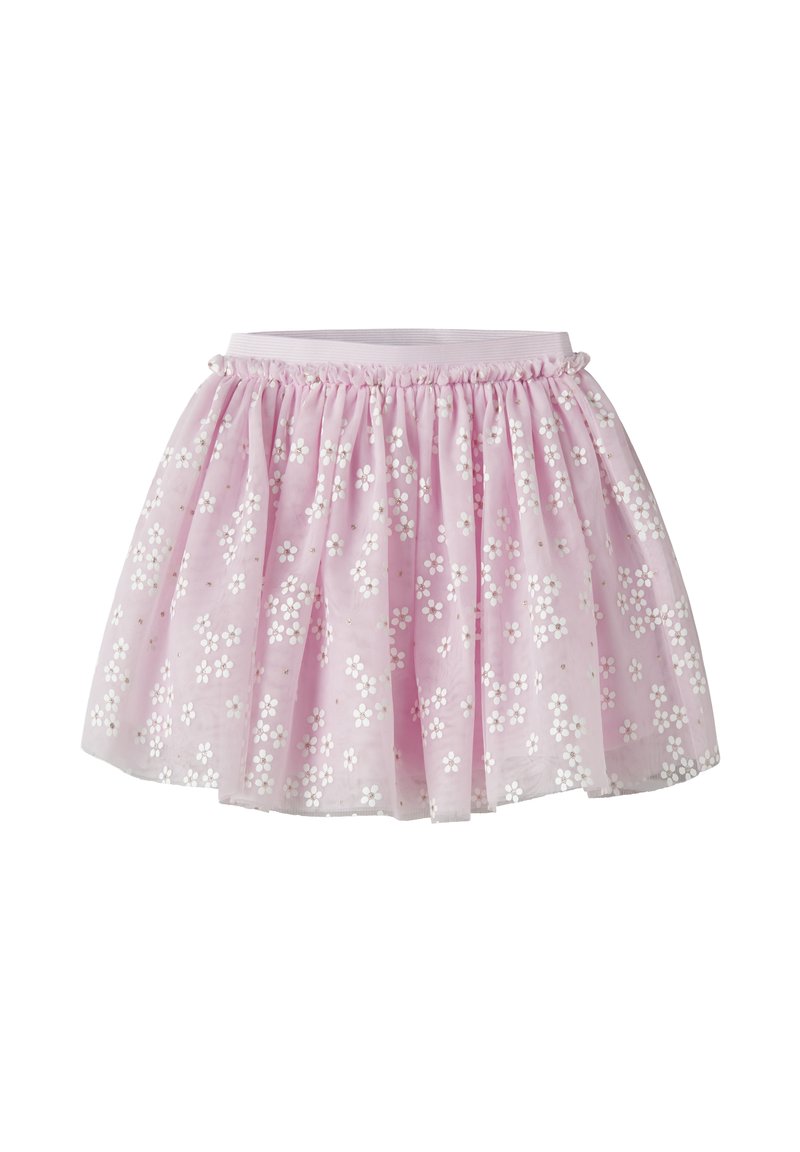 Różowa spódnica z tiulu z białymi wzorami kwiatów, elastycznym, marszczonym pasem i rozkloszowanym, warstwowym krojem, idealna dla dziecka.