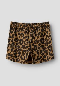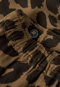 Dziewczyna w białej bluzie z nadrukiem geparda i napisem "Love More", w spódnicy w panterkę, białych skarpetkach i beżowych butach stoi na jednolitym tle.