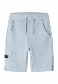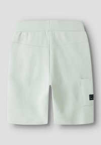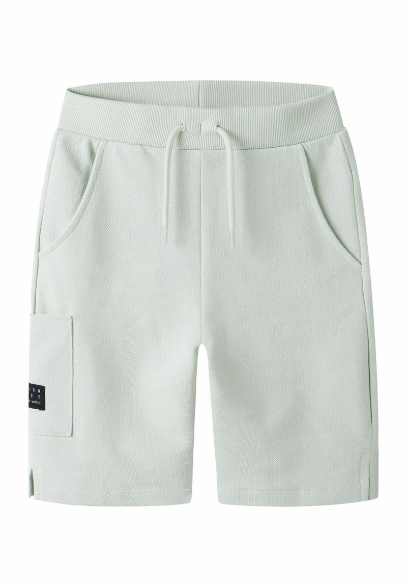 Jasnoszare casualowe szorty z prążkowanym elastycznym pasem, sznurkiem, dwoma bocznymi kieszeniami oraz kieszenią cargo z czarną metką na lewej nogawce.