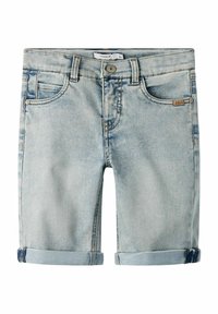 Biała koszulka z napisem "Studio edition", jasnoniebieskie dżinsowe szorty z podwiniętymi nogawkami, białe sneakersy i czarno-białe skarpetki w paski.