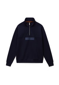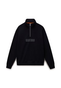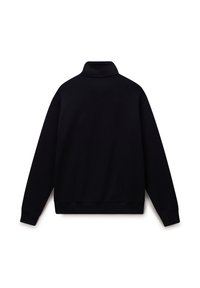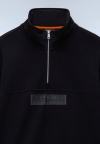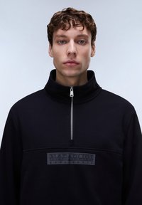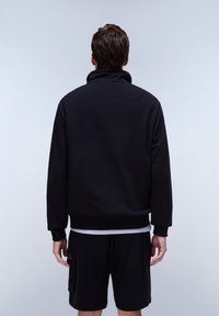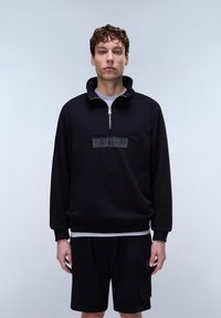 Młody mężczyzna w czarnym pulowerze z półzamkiem i czarnych szortach bojówkach, stojący na tle jednolitego jasnego tła, zwrócony przodem.