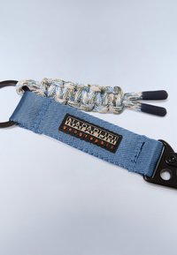 Niebieski brelok z tkaniny z czarnym metalowym klipsem, plecionym szarym i niebieskim sznurkiem oraz naszywką z napisem "Napapijri Geographic".