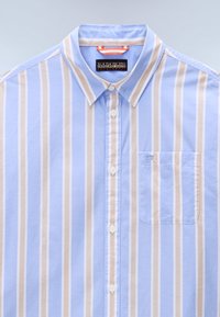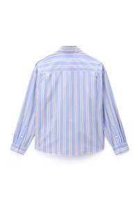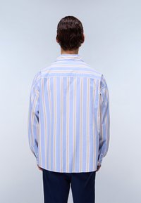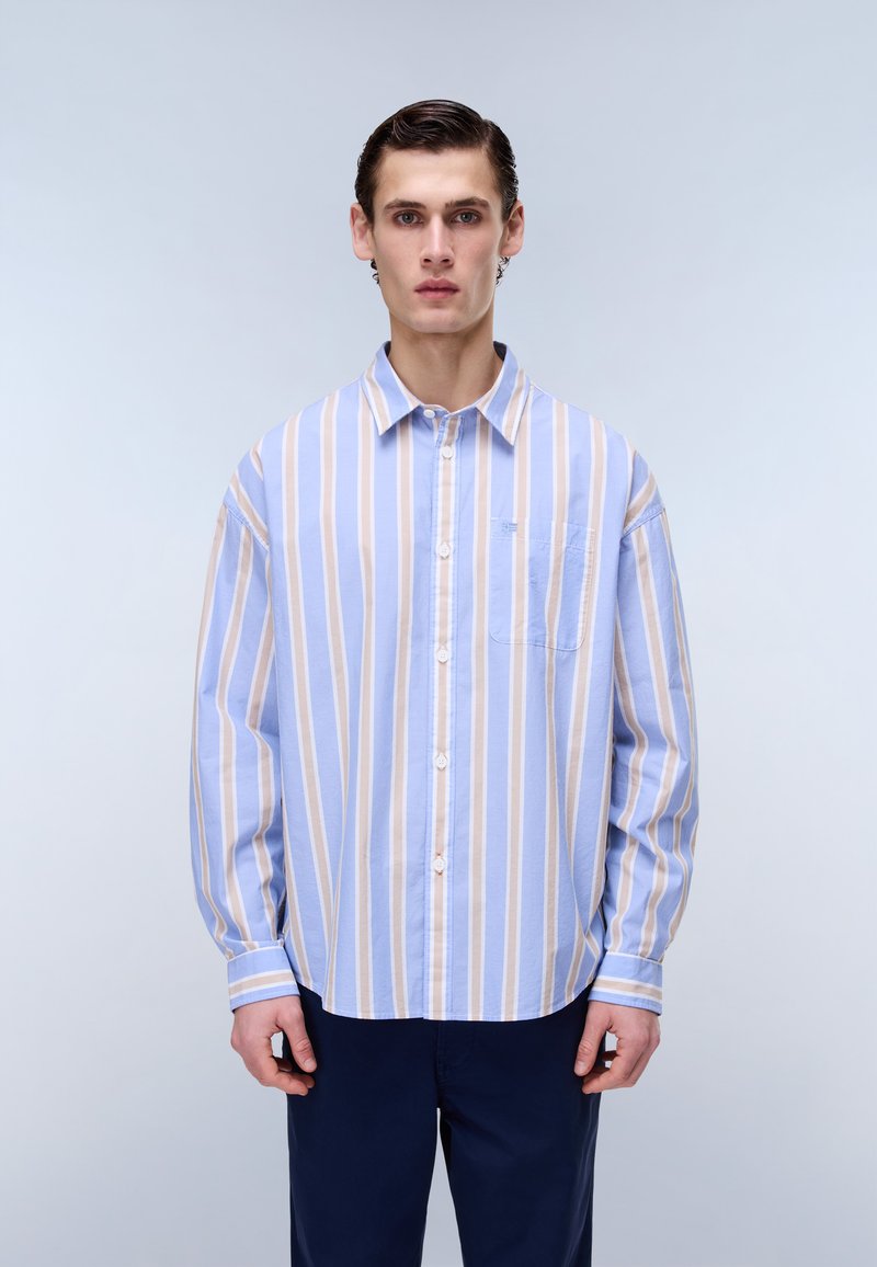Młody mężczyzna stojący, ubrany w koszulę z pionowymi paskami w jasnoniebieskim i beżowym kolorze oraz ciemnoniebieskie spodnie, zwrócony przodem na jednolitym tle.