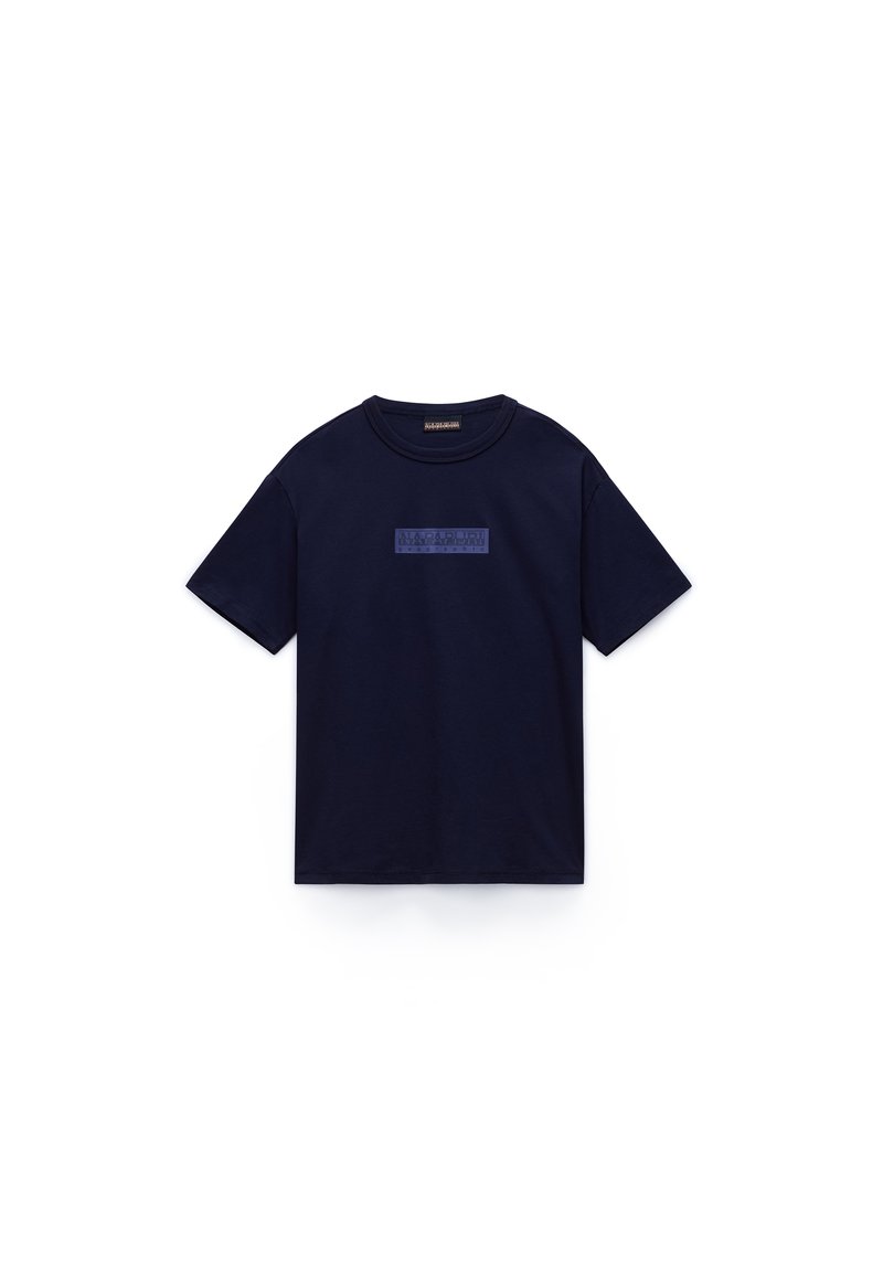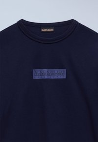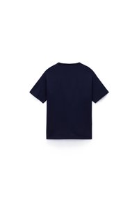 Granatowy T-shirt z krótkim rękawem i okrągłym dekoltem, z małą prostokątną naszywką z logo na środku klatki piersiowej.
