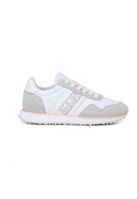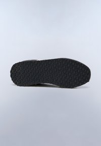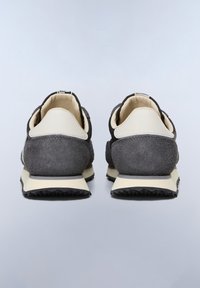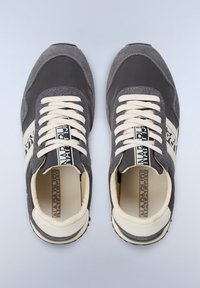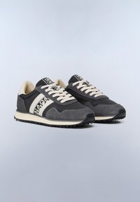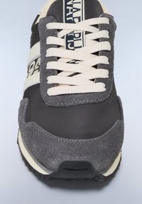 Czarny i szary zamszowy sneaker z białymi paskami i sznurowadłami, logo "NAPAPIJRI" po bokach, kremowa podszewka i czarna, ryflowana podeszwa.
