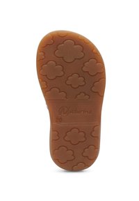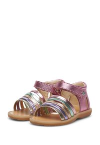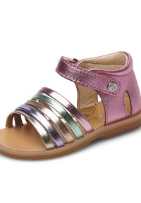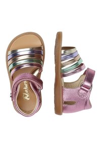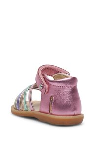 Różowe metaliczne sandały z zamkniętą piętą, z pięcioma kolorowymi metalicznymi paseczkami w kolorze złotym, zielonym i fioletowym. Regulowany pasek zapewniający pewne dopasowanie.