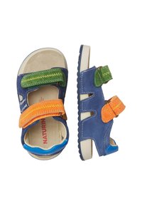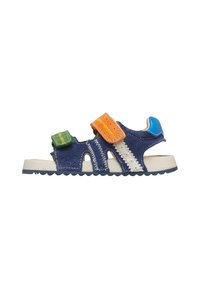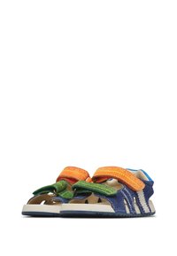 Niebieska sandał dziecka z zielonymi i pomarańczowymi regulowanymi paskami, białą podeszwą i niebieską łatą na pięcie, zaprojektowana z myślą o komforcie i łatwym noszeniu.