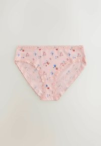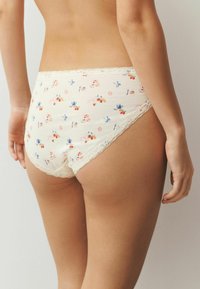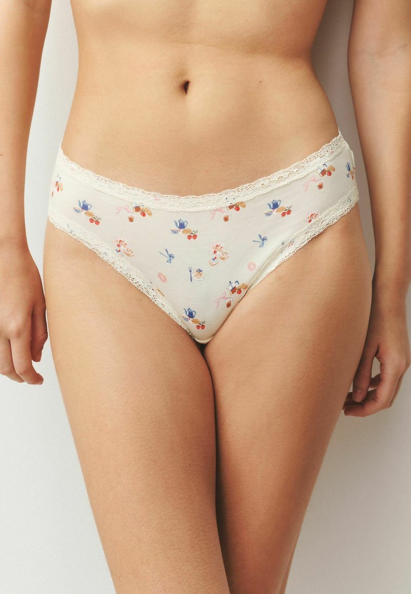 Kobieta w kremowych figach bikini z małymi kolorowymi wzorami kwiatów i imbryków, wykończonych koronką przy pasku i wycięciach na nogi.