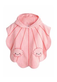 Różowy ręcznik w stylu ponczo z kapturem; posiada wzory muszli przegrzebków oraz pionowe przeszycia dla uzyskania faktury. Miękki, chłonny materiał.