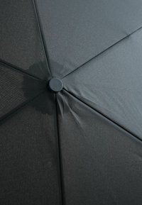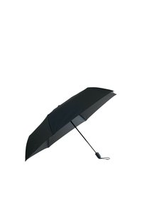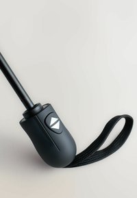 Kompaktowa czarna składana parasolka zamknięta w ochronnym pokrowcu z paskiem na nadgarstek oraz automatycznym przyciskiem otwierania i zamykania na uchwycie.