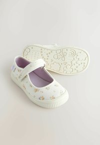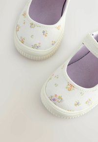 Biały but Mary Jane na płótnie z pastelowym kwiatowym nadrukiem, regulowanym paskiem, gumową podeszwą i małym fioletowym haftowanym logo po boku.