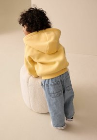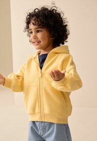 Małe dziecko o kręconych włosach, ubrane w żółtą bluzę na zamek, luźne spodnie w paski i granatowe trampki, stoi na jednolitym tle.