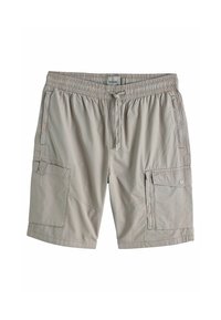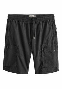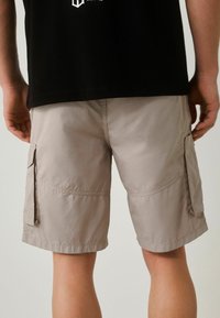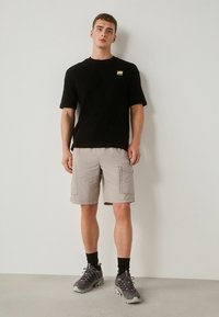 Mężczyzna w beżowych szortach typu cargo z wieloma kieszeniami i sznurkiem w talii, w czarnej koszulce, ukazany od talii do kolan.