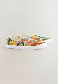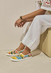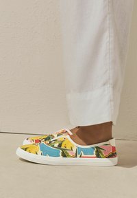 Stopy w białych spodniach i wsuwanych płóciennych butach z kolorowym tropikalnym wzorem owoców i liści na beżowej podłodze.