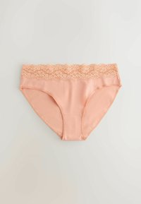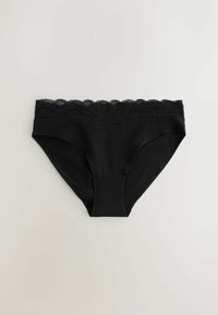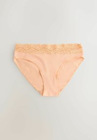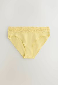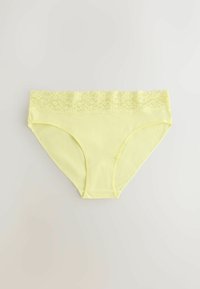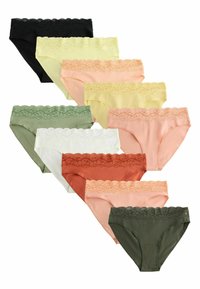 Dziewięć bawełnianych majtek damskich w różnych kolorach, każda z szeroką koronkową gumką w talii, ułożonych w opadającą linię diagonalną.