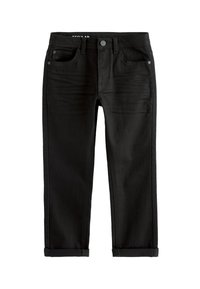 Ciemnoniebieskie dżinsy o klasycznym kroju, z podwiniętymi mankietami, pięcioma kieszeniami i kontrastującymi detalami haftu.