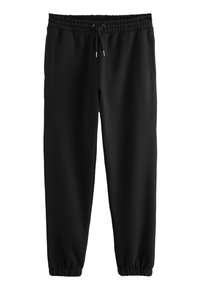 Granatowe dresy z elastycznym pasem, sznurkiem i ściągaczami na kostkach; wykonane z miękkiego, gładkiego materiału.