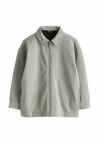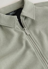 Jasnozielona kurtka na zamek z kołnierzem, wykonana z teksturowanej tkaniny, wyposażona w dwie boczne kieszenie. Ściągacze na mankietach i prosty krój.