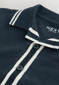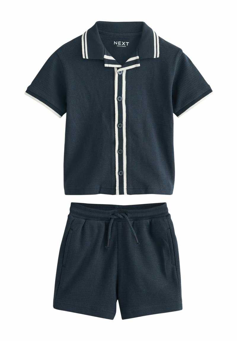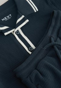 Granatowy zestaw koszulek polo z krótkim rękawem i spodenek, z białymi paskami na kołnierzyku i rękawach, z przodu zapinany na guziki, z elastycznym pasem i sznurkiem do regulacji.