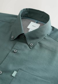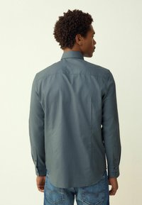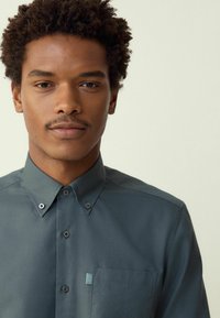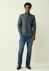 Mężczyzna o kręconych włosach, ubrany w ciemnoszarą koszulę zapinaną na guziki i niebieskie jeansy, pozuje z jedną ręką w kieszeni, patrząc na bok.