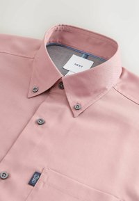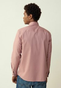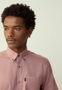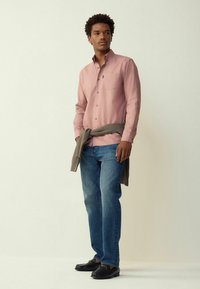 Mężczyzna o krótkich kręconych włosach stoi, ubrany w malinową różową koszulę zapinaną na guziki z kieszenią oraz niebieskie dżinsy, patrzy w lewo.