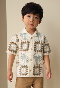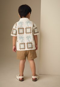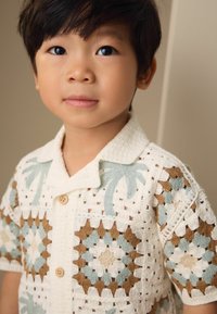 Młody chłopiec uśmiechający się, ubrany w szydełkowaną koszulkę z krótkim rękawem w niebieskie, brązowe i białe wzory oraz beżowe szorty, stojący na jednolitym tle.