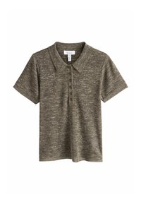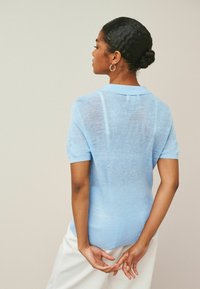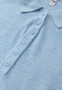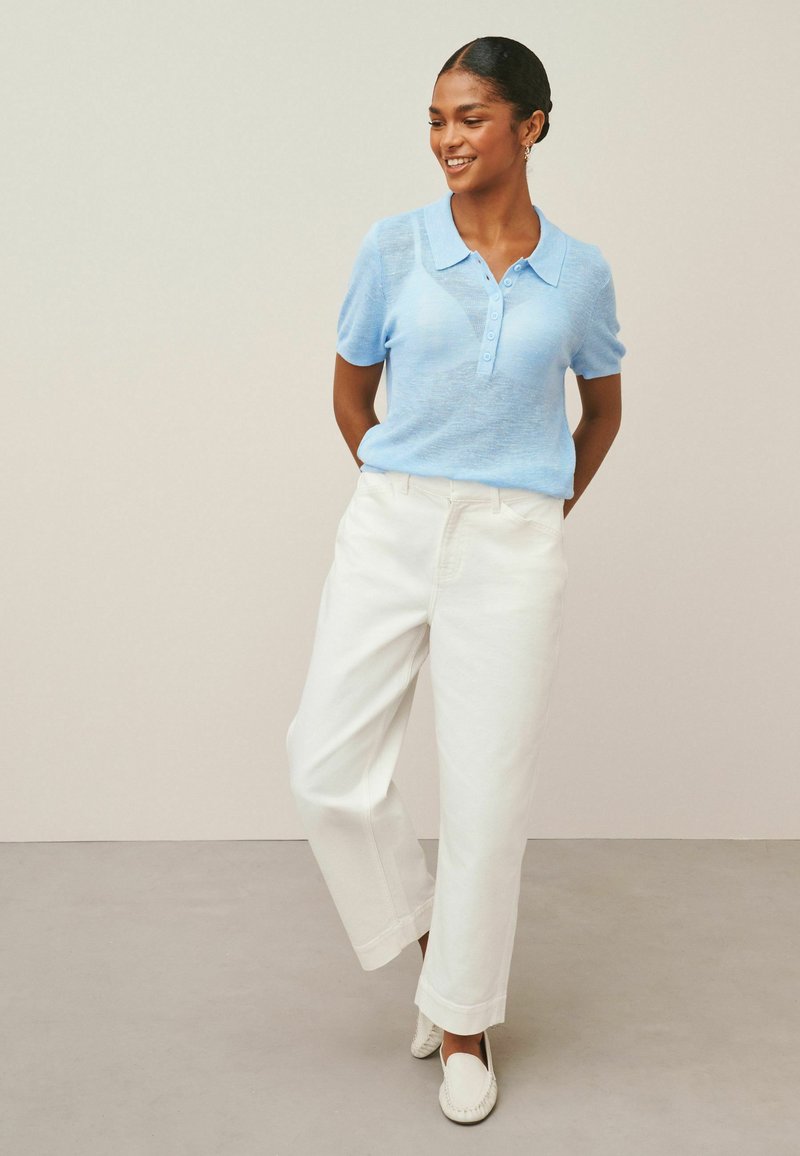 Kobieta uśmiechająca się z rękami za plecami, ubrana w jasnoniebieską koszulkę polo z krótkim rękawem, białe szerokie spodnie i białe buty wsuwane.