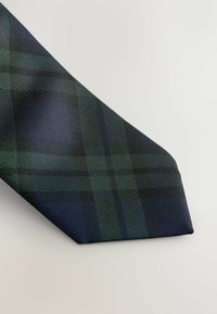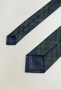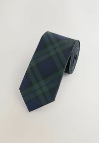 Granatowo-zielony krawat męski w kratę, z klasycznym zakończeniem w szpic, na białym tle.