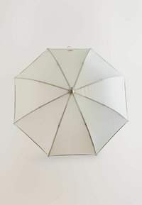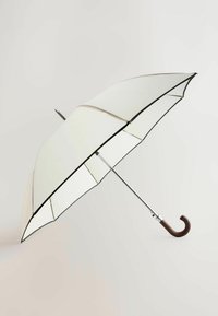 Beżowy parasol z wykręconym wzorem tkaniny, czarną lamówką i drewnianą, zakrzywioną rączką, wyposażony w metalową trzon i czarny grot.