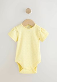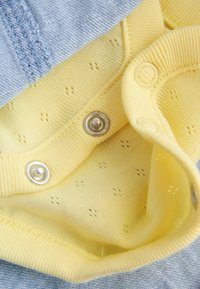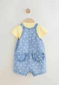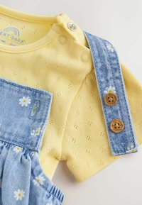 Jasnoniebieska sukienka ogrodniczka z dżinsu z żółtą koszulą z krótkim rękawem. Ogrodniczka zdobiona jest białym nadrukiem stokrotek i drewnianymi guzikami; wykonana z miękkiej bawełny.
