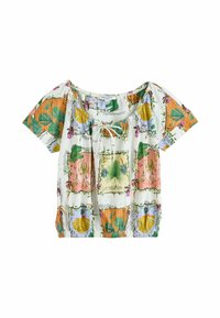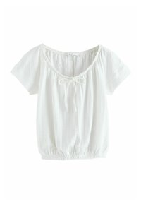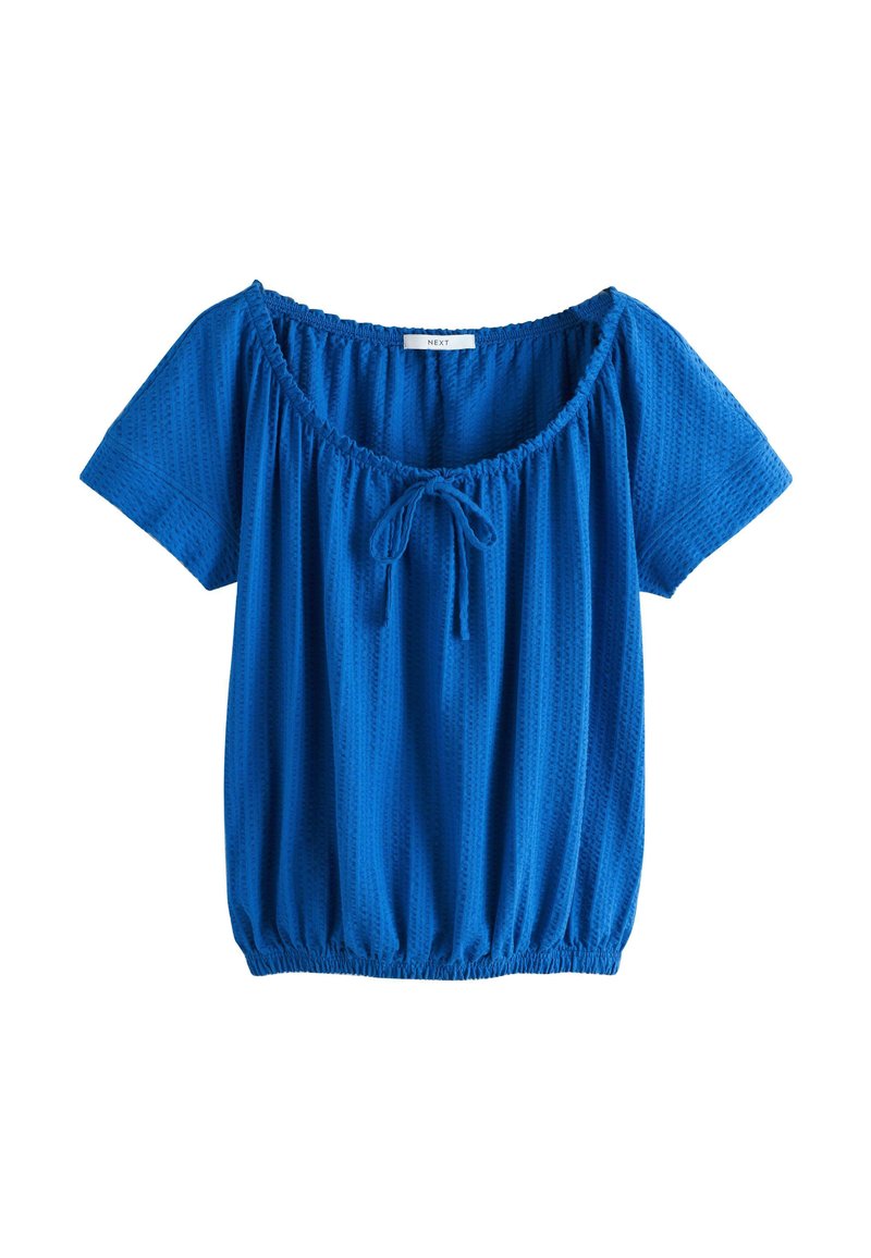 Niebieska bluzka z krótkim rękawem wykonana z fakturowanej tkaniny, z elastycznym dołem i dekoltem oraz małą kokardką na środku przodu.