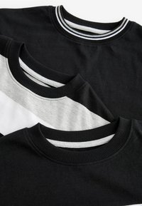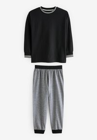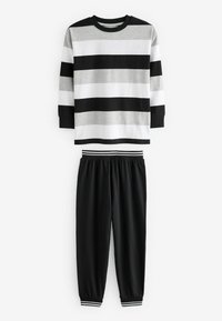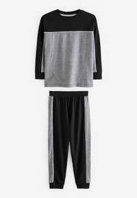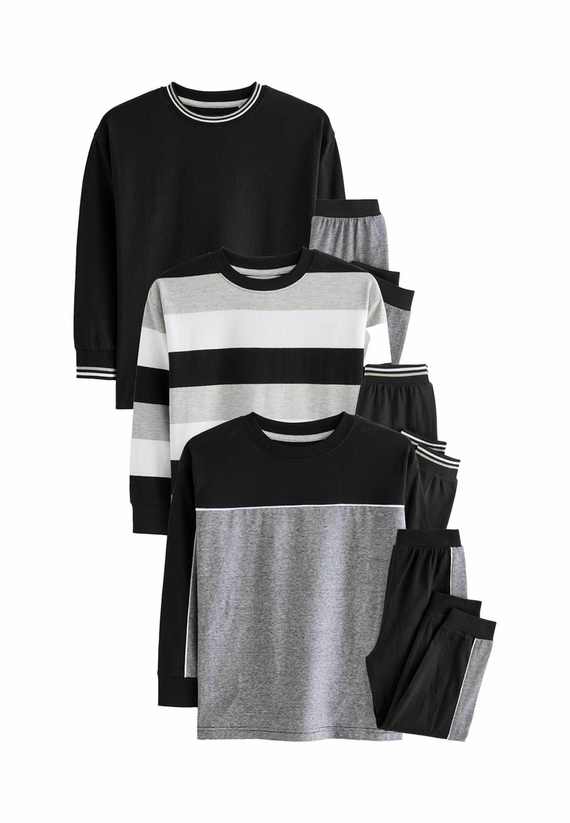 Zestaw trzech koszul z długim rękawem i dwóch par spodni. Kolory: czarny, szary, biały. Wzory w paski i blokowe. Materiał bawełniany.