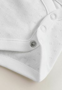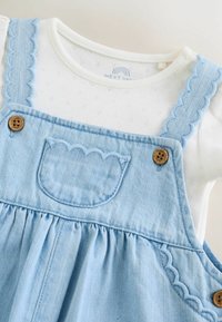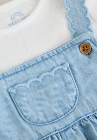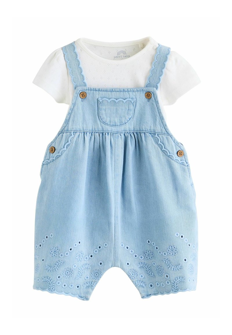 Biała koszulka niemowlęca z krótkim rękawem w połączeniu z jasno niebieskimi, haftowanymi ogrodniczkami dżinsowymi z falowanymi krawędziami i drewnianymi guzikami.