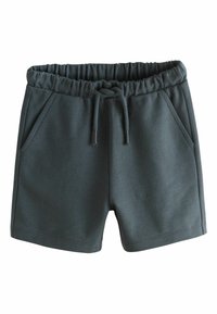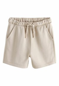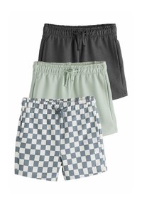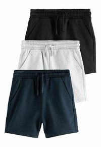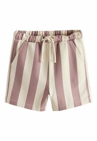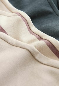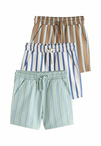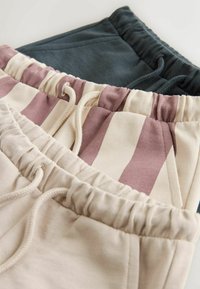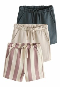 Trzy pary szortów: jedna w ciemnoszarym kolorze, jedna w jednolitym beżowym, oraz jedna w paski w kolorze jasnego kremu i przydymionego różu. Każda z nich ma elastyczną talię i kieszenie.