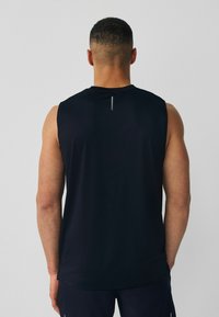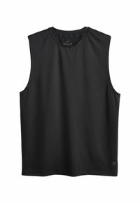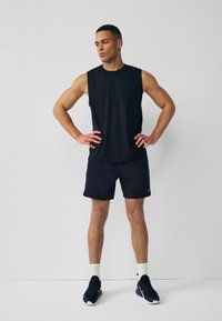 Muskularny mężczyzna stoi, ubrany w czarną sportową koszulkę bez rękawów i czarne spodenki, patrzy w lewo na jednolitym tle.