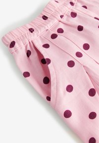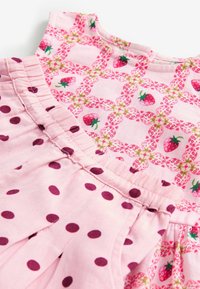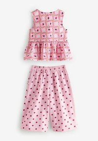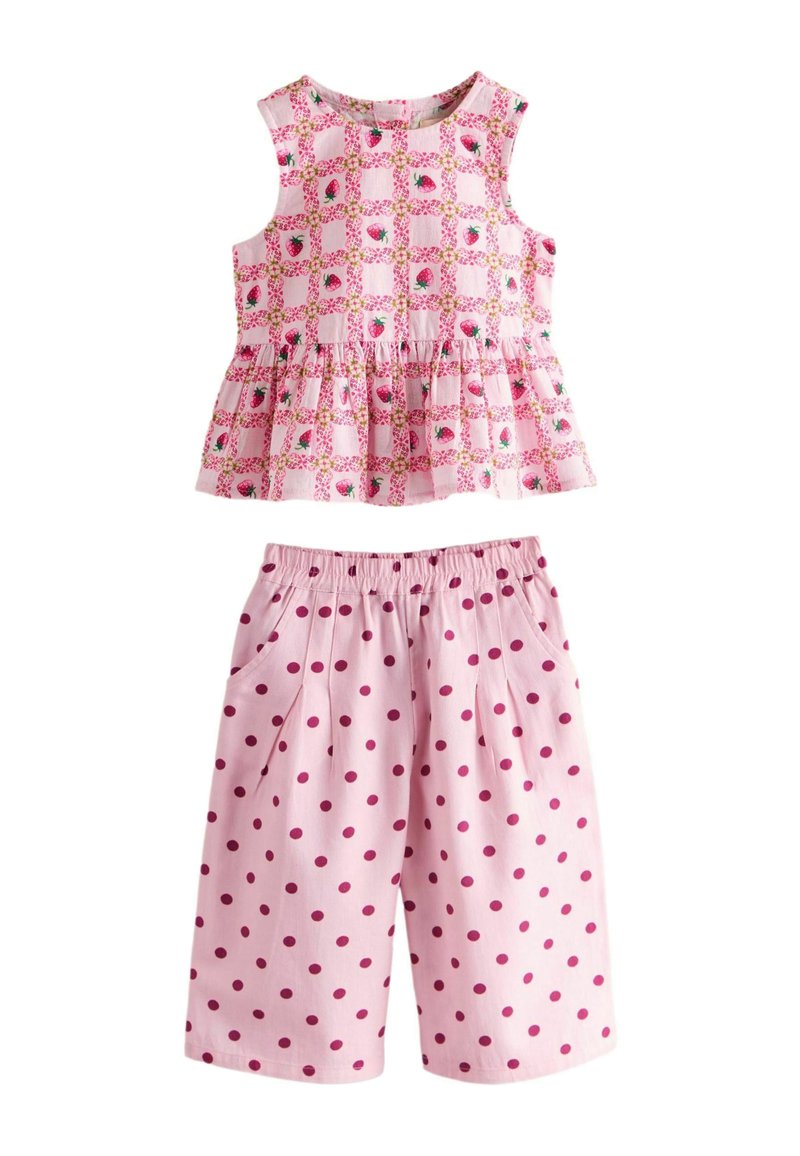 Różowy top bez rękawów dla małego dziecka z nadrukiem truskawek oraz dopasowane różowe spodenki w ciemnoróżowe grochy z elastycznym paskiem w talii.