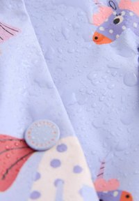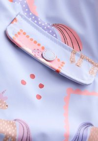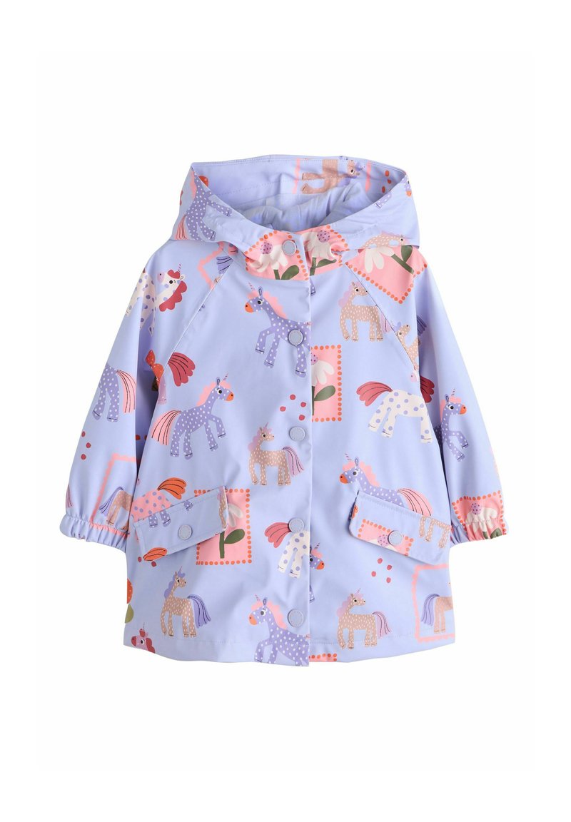 Jasnoniebieska peleryna przeciwdeszczowa z zabawnym wzorem jednorożców w różowo-fioletowych akcentach, z elastycznymi mankietami i zapięciami na zatrzaski.