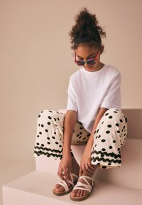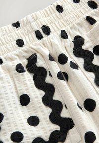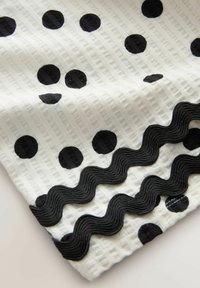 Młoda osoba z kręconymi włosami związanymi w kok nosi białą bluzkę z krótkim rękawem oraz luźne białe spodnie w czarne kropki z falistym wykończeniem.