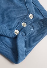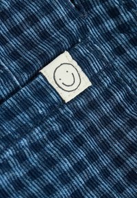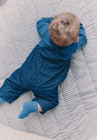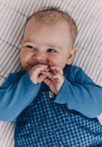 Niemowlę leżące na prążkowanym materacu, ubrane w niebieskie ogrodniczki w wzory, niebieską koszulę z długim rękawem i niebieskie skarpetki, patrzące na bok.