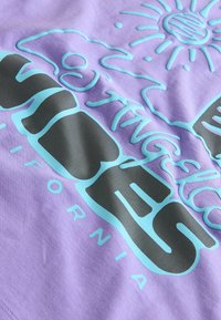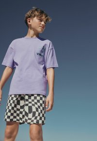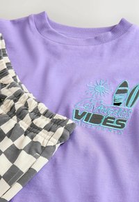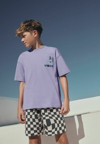 Chłopiec w lawendowej koszulce z napisem "Los Angeles Vibes", czarno-białych szortach w kratę, fioletowych skarpetkach i czarnych tenisówkach stoi na zewnątrz.
