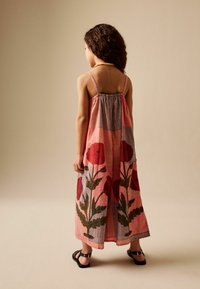 Dziewczyna o kręconych włosach, ubrana w czerwoną sukienkę w kratkę z dużymi kwiatowymi wzorami, czarne sandały i żółty naszyjnik z koralików, uśmiechająca się i stojąca.