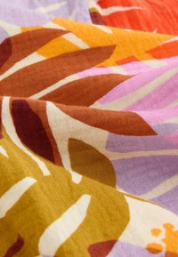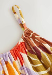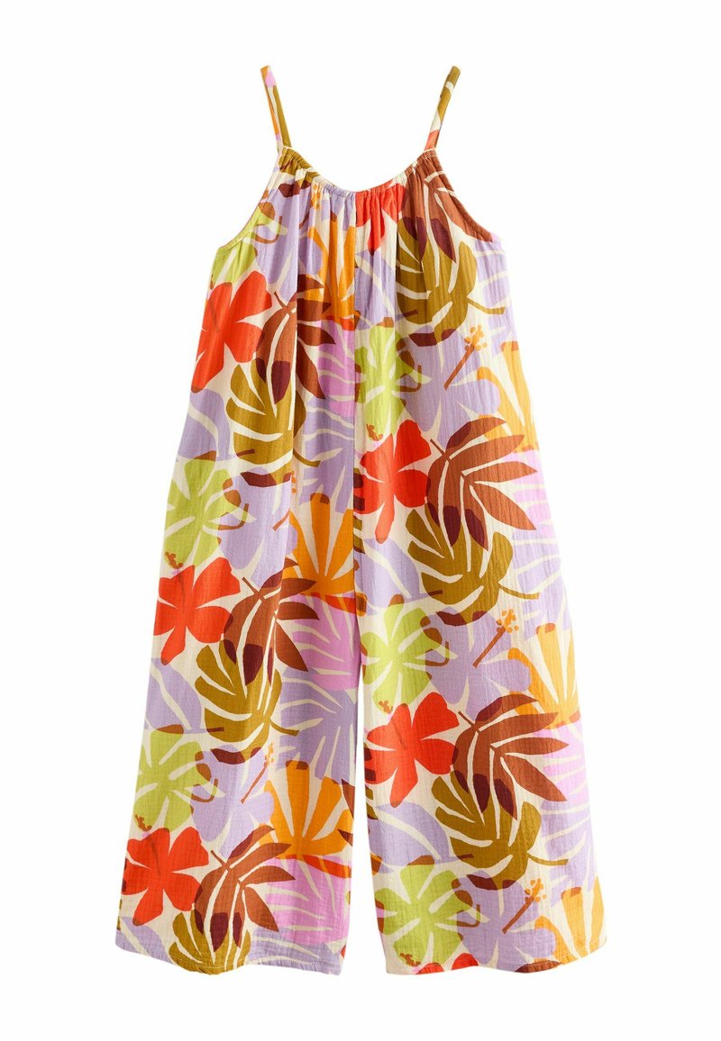 Bezrekawny kombinezon z szerokimi nogawkami na cienkich ramiączkach, ozdobiony kolorowym tropikalnym wzorem liści i kwiatów w odcieniach pomarańczu, zieleni, brązu i fioletu.