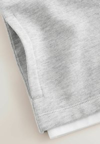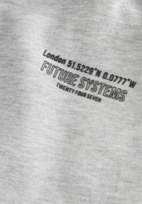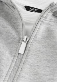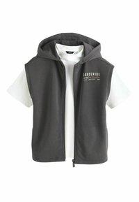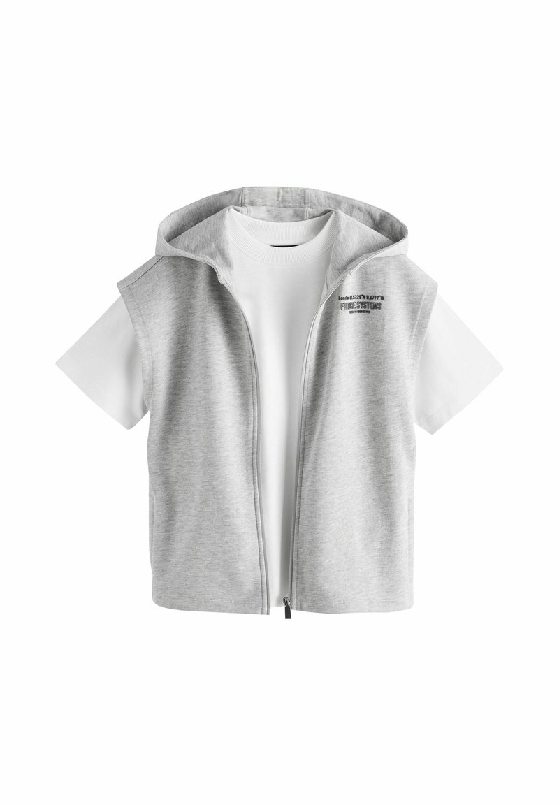 Biała koszulka z krótkim rękawem, zestawiona z bezrękawnikiem w jasnoszarym kolorze na zamek, posiadającym kaptur i mały czarny napis na piersi.