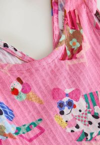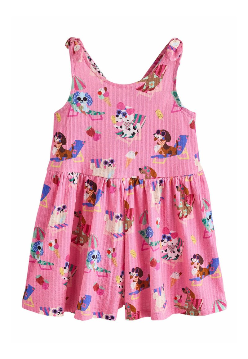 Różowa sukienka bez rękawów dla malucha z zabawnym wzorem psów noszących okulary przeciwsłoneczne, odpoczywających na krzesłach, oraz rozrzuconych po całej sukience rożków lodów.