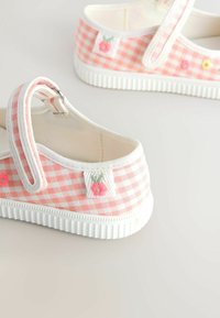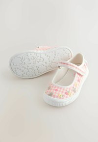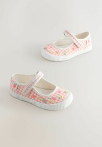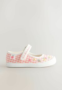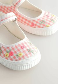 Różowo-biały but typu Mary Jane w kratkę gingham z białą podeszwą i paskiem, ozdobiony drobnymi haftowanymi pastelowymi kwiatami.