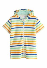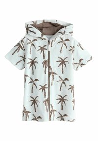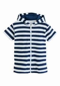 Niebieska, krótkorękawowa bluza z kapturem na zamek, wykonana z miękkiego materiału, z podszytym kapturem w białe i jasnoniebieskie paski. Gładka faktura, bez dodatkowych ozdób.