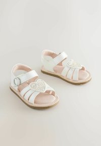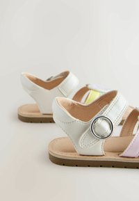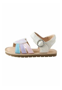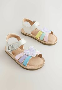 Biała sandał dziecięcy z niebieskimi, fioletowymi i różowymi paskami, błyszczącą ozdobą w kształcie serca oraz paskiem na kostkę z srebrną klamrą.