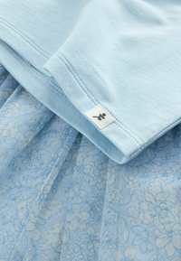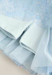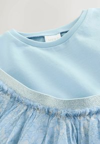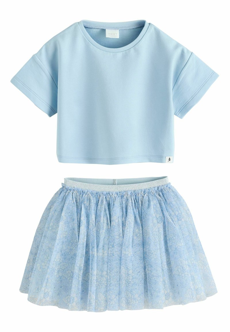 Jasnoniebieski krótki top z krótkim rękawem w połączeniu z jasnoniebieską, kwiecistą siateczkową spódnicą z elastycznym pasem, zaprojektowaną dla dzieci.