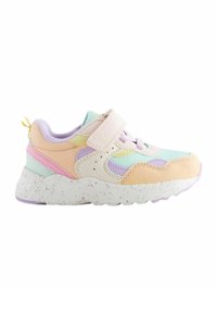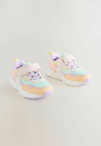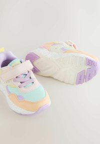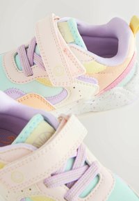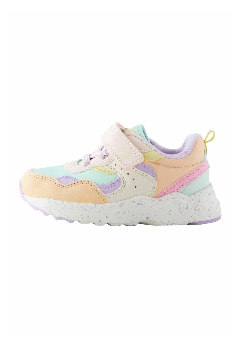 Pastelowy dziecięcy tenisówka z paskiem na rzep, jasnofioletowymi sznurowadłami, białą podeszwą w cętki oraz żółtym pętelką na pięcie.