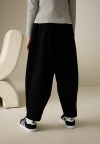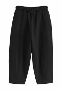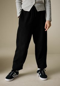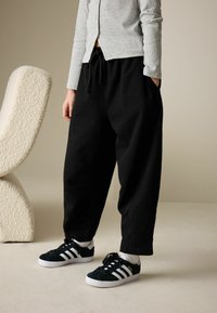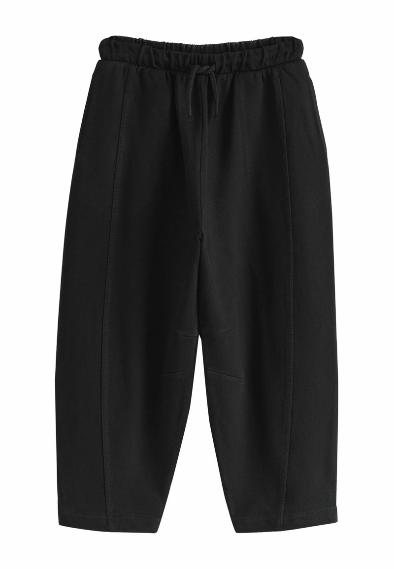 Czarne spodnie dresowe z elastycznym pasem i sznurkiem do regulacji, wyposażone w boczne kieszenie i luźny krój, wykonane z miękkiej bawełnianej tkaniny.